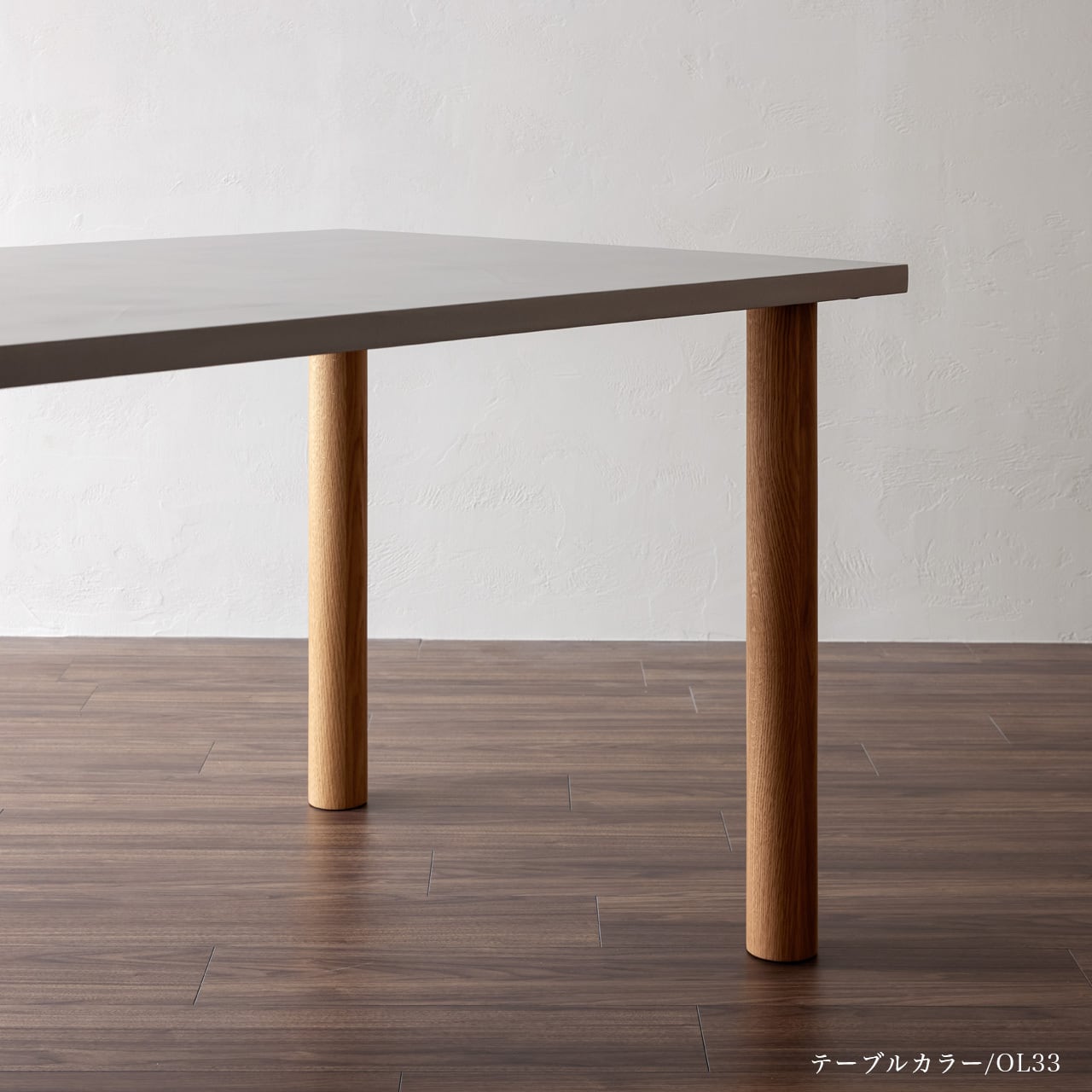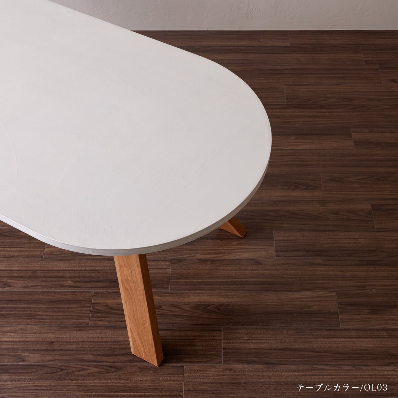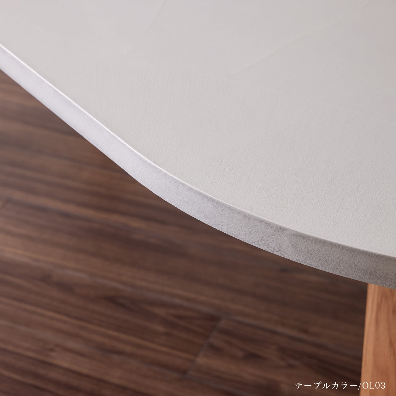カラー30色から選べる、発色がよくシャープなコテ波の表情が特徴のOLTREMATERIAにて仕上げた天板と木脚を組み合わせた、シンプルモダンなデザインのテーブルです。