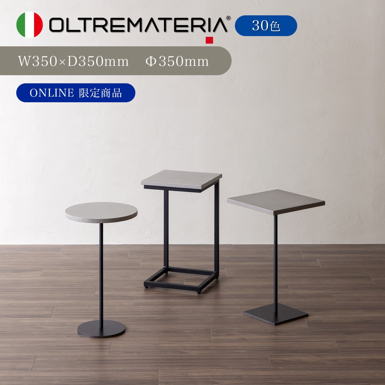 カラー30色から選べる、発色がよくシャープなコテ波の表情が特徴のOLTREMATERIAにて仕上げた天板と、3種類のデザインとアイアン脚を組み合わせた、シンプルモダンなデザインのサイドテーブルです。